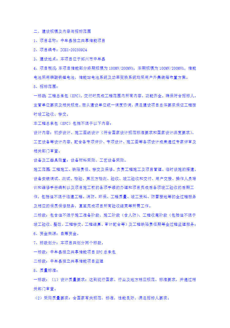 (001)一标段:中牟县独立共享储能项目 epc总承包;