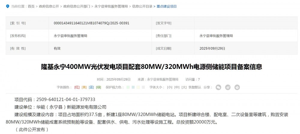 隆基永宁400mw光伏发电项目配套80mw/320mwh电源侧储能项目备案信息