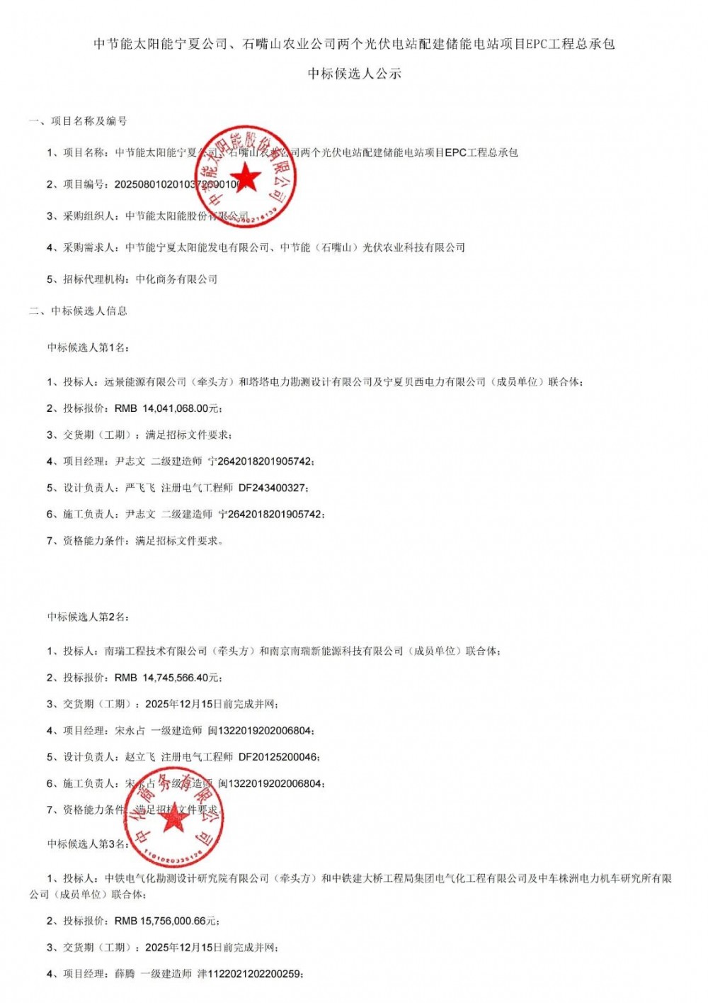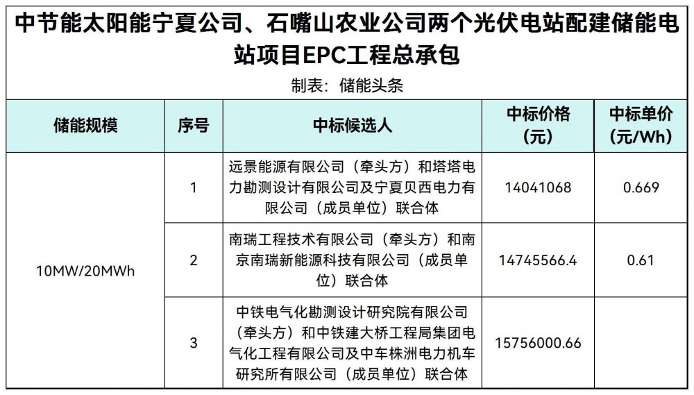 9月28日,中节能太阳能宁夏公司、石嘴山农业公司两个光伏电站配建储能电站项目epc工程总承包中标候选人公示。