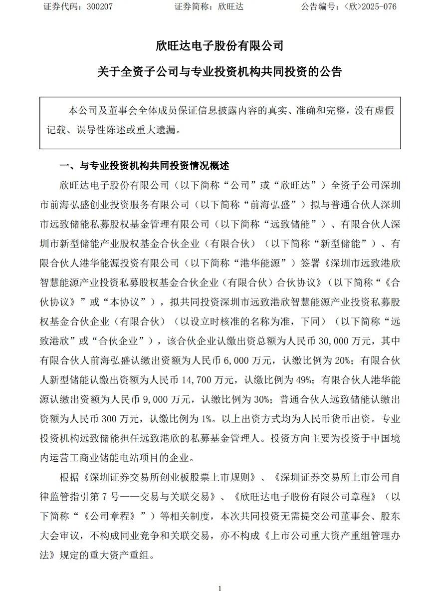 9月21日,欣旺达电子股份有限公司全资子公司深圳市前海弘盛创业投资服务有限公司正式敲定出资方案,拟以6000万元认缴额参与设立深圳市远致港欣智慧能源产业投资私募股权基金合伙企业,占比20%。