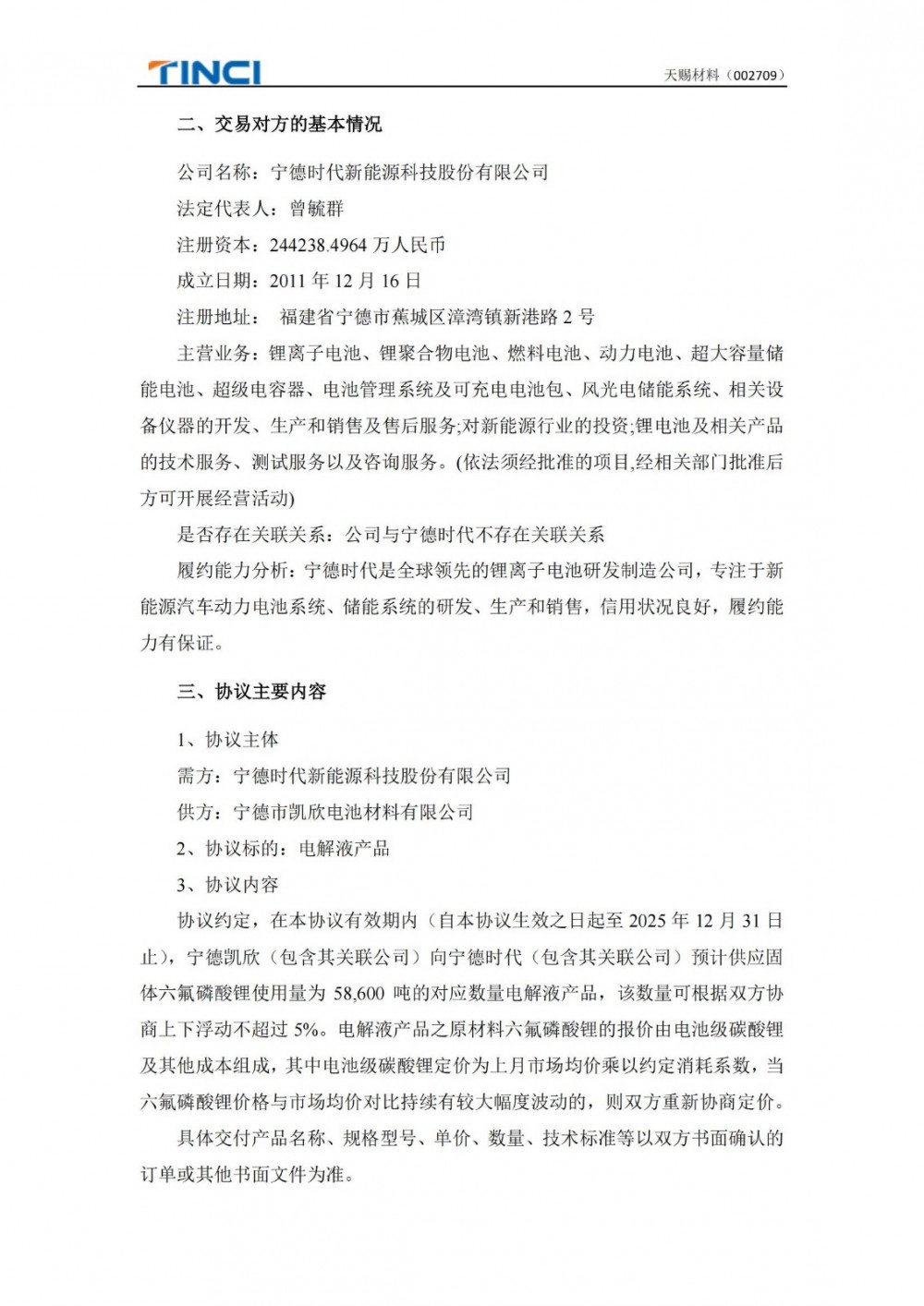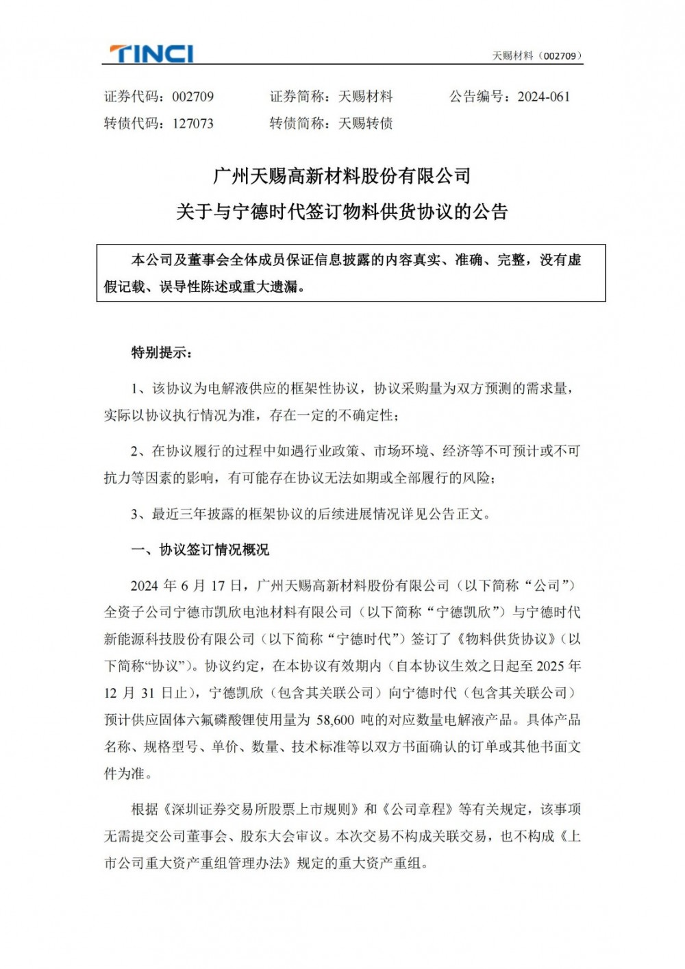 据能源圈了解到,6月17日,天赐材料发布公告称,公司全资子公司宁德凯欣与宁德时代签订了《物料供货协议》。协议约定,在本协议有效期内(自本协议生效之日起至2025年12月31日止),宁德凯欣(包含其关联公司)向宁德时代(包含其关联公司)预计供应固体六氟磷酸锂使用量为58,600吨的对应数量电解液产品。