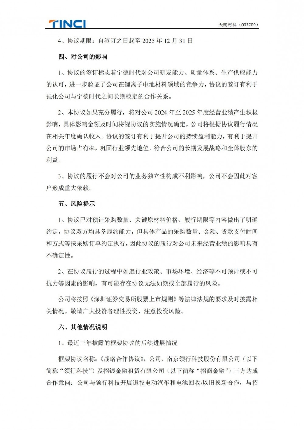 天赐材料表示,协议的签订标志着宁德时代对公司研发能力、质量体系、生产供应能力的认可,进一步验证了公司在锂离子电池材料领域的竞争力,协议的签订有利于强化公司与宁德时代之间长期稳定的合作关系。