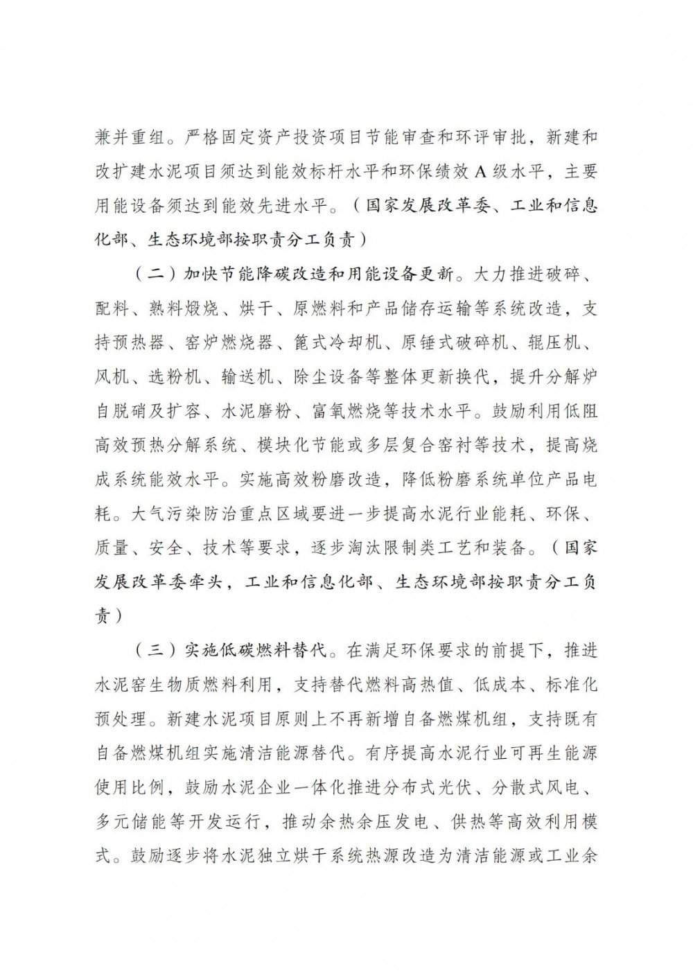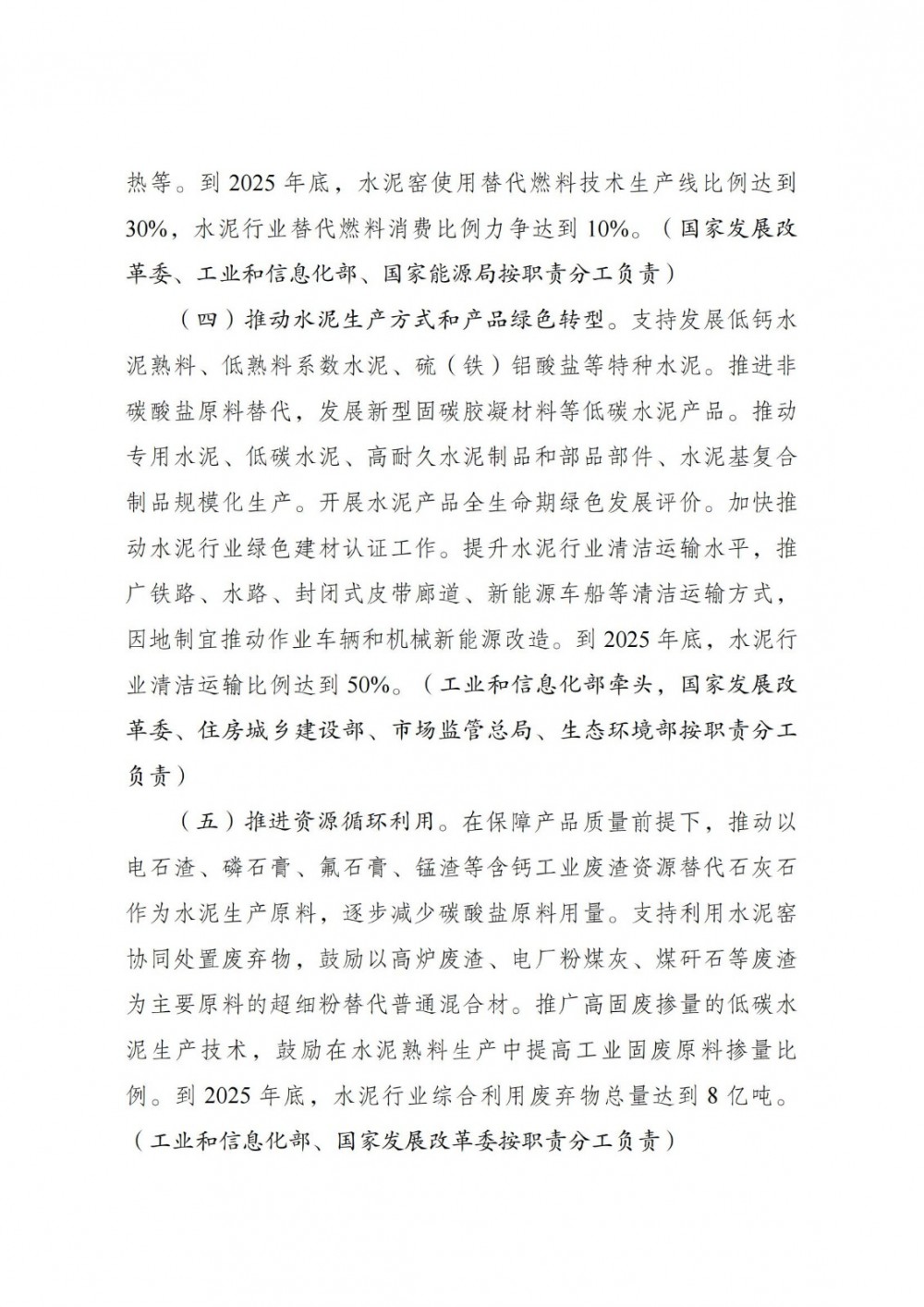 文件提出,在满足环保要求的前提下,推进水泥窑生物质燃料利用,支持替代燃料高热值、低成本、标准化预处理。新建水泥项目原则上不再新增自备燃煤机组,支持既有自备燃煤机组实施清洁能源替代。有序提高水泥行业可再生能源使用比例,鼓励水泥企业一体化推进分布式光伏、分散式风电、多元储能等开发运行,推动余热余压发电、供热等高效利用模式。