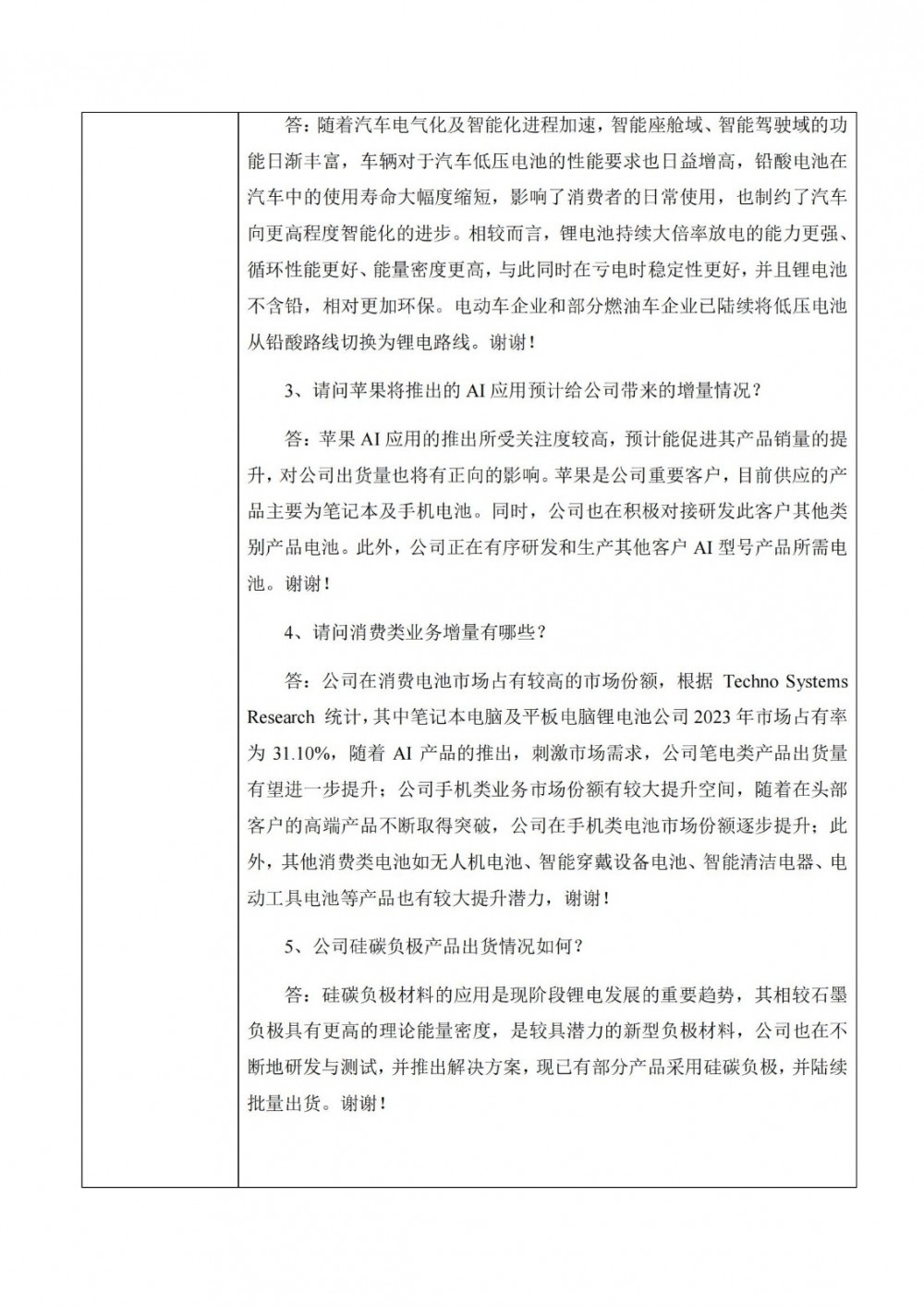 除此之外,记录表显示,珠海冠宇在消费电池市场占有较高的市场份额,根据technosystemsresearch统计,其中笔记本电脑及平板电脑锂电池公司2023年市场占有率为31.10%,随着ai产品的推出,刺激市场需求,公司笔电类产品出货量有望进一步提升;公司手机类业务市场份额有较大提升空间,随着在头部客户的高端产品不断取得突破,公司在手机类电池市场份额逐步提升;此外,其他消费类电池如无人机电池、智能穿戴设备电池、智能清洁电器、电动工具电池等产品也有较大提升潜力。