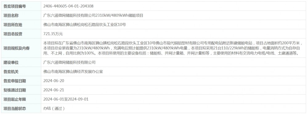 据能源圈了解到,近日,广东六遥微网储能科技有限公司2310kw/4809kwh储能项目获得备案。