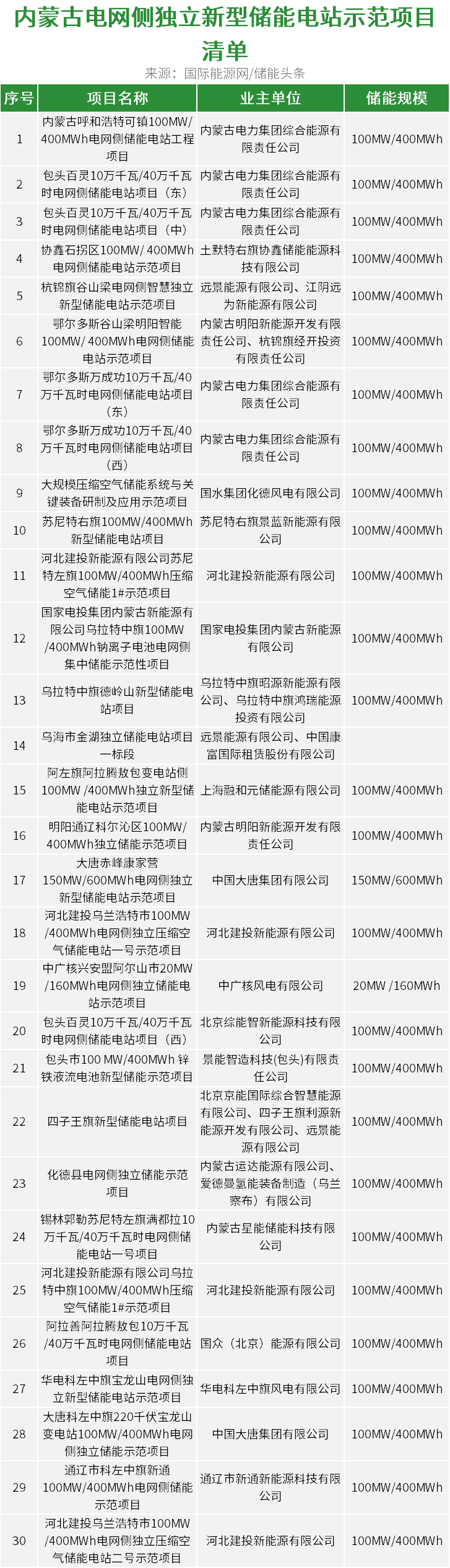 内蒙古共公示了两批电网侧独立新型储能电站示范项目清单: