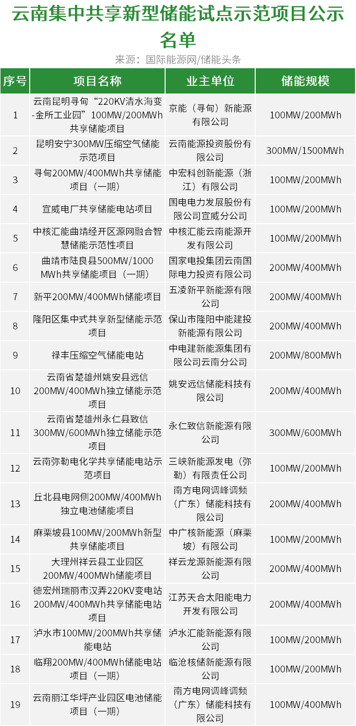 1月8日,云南能源局发布了《云南省能源局关于公示云南集中共享新型储能试点示范项目的通知》。