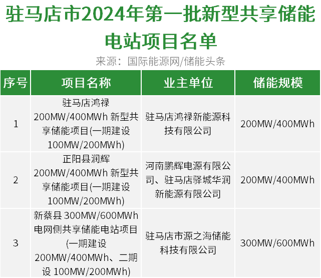 《通知》公布了驻马店市3个2024年第一批新型共享储能电站项目名单。驻马店市2024年第一批新型共享储能电站项目共3个,项目总规模700mw/1400mwh,总投资20.5亿元。