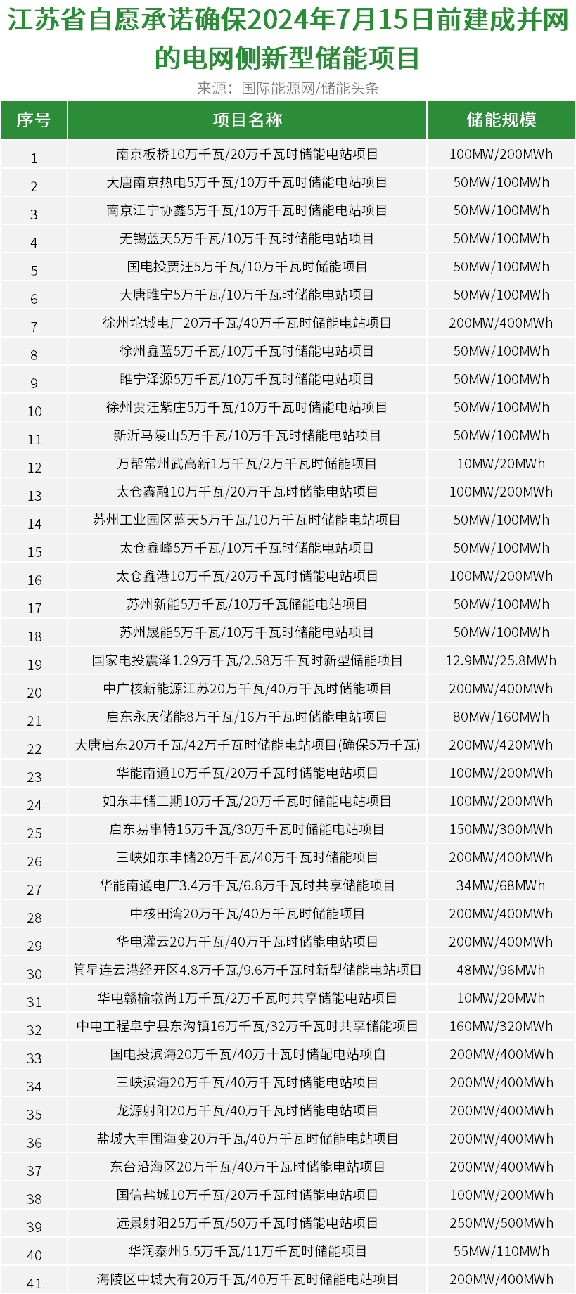 《通知》指出,经多次协调和反复梳理,全省41个已纳规的电网侧新型储能项目自愿承诺确保在2024年7月15日前建成并网,项目容量共计约400万千瓦。