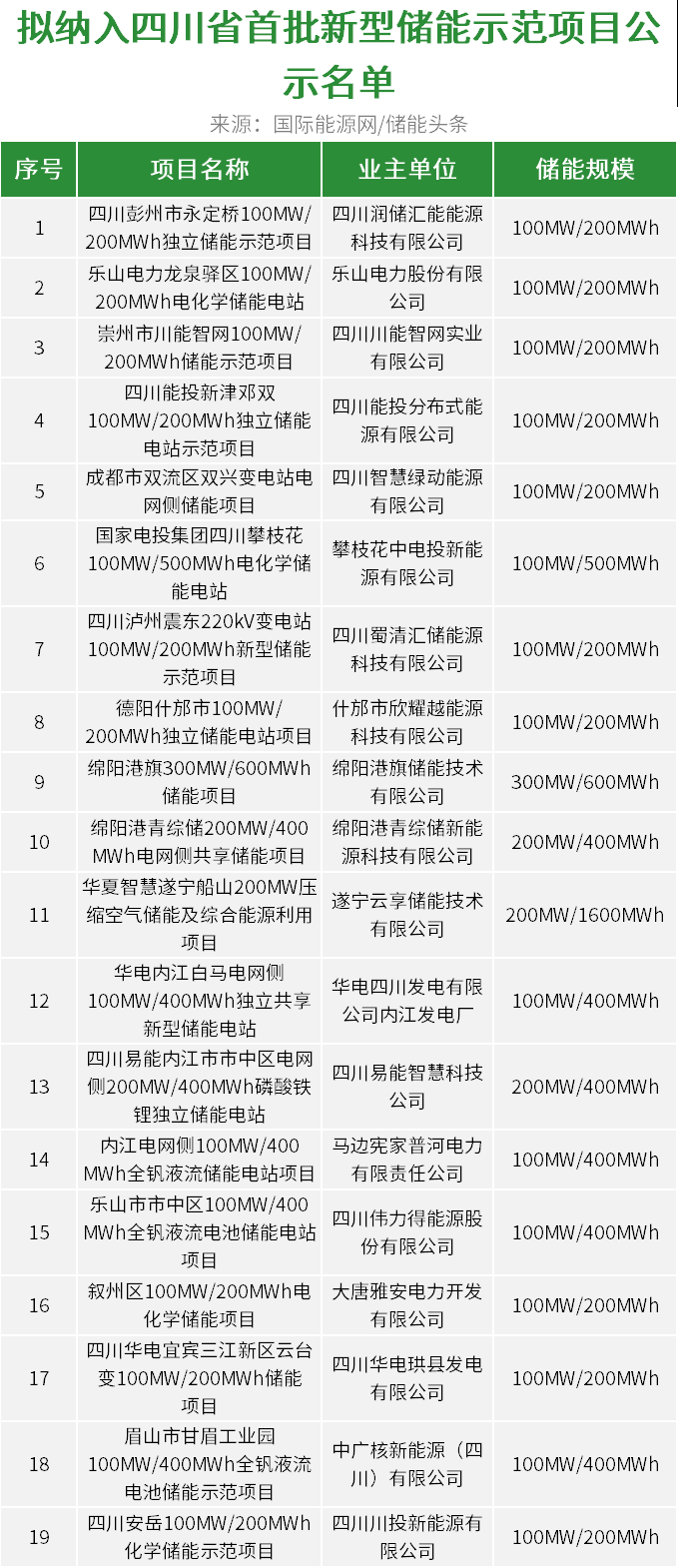 3月25日,四川省发展和改革委员会、四川省能源局发布了《关于公示拟纳入四川省首批新型储能示范项目名单的通知》。《通知》拟将“四川润储汇能彭州永定桥100mw/200mwh电化学储能电站”等19个项目列为首批新型储能试点示范项目。装机规模共计2.4gw/7.1gwh。