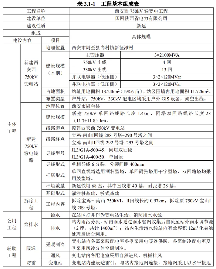西安西 750kv 输变电工程位于西安市周至县,工程建设内容主要包括新建一座750kv 变电站和新建 750kv 架空输电线路工程。