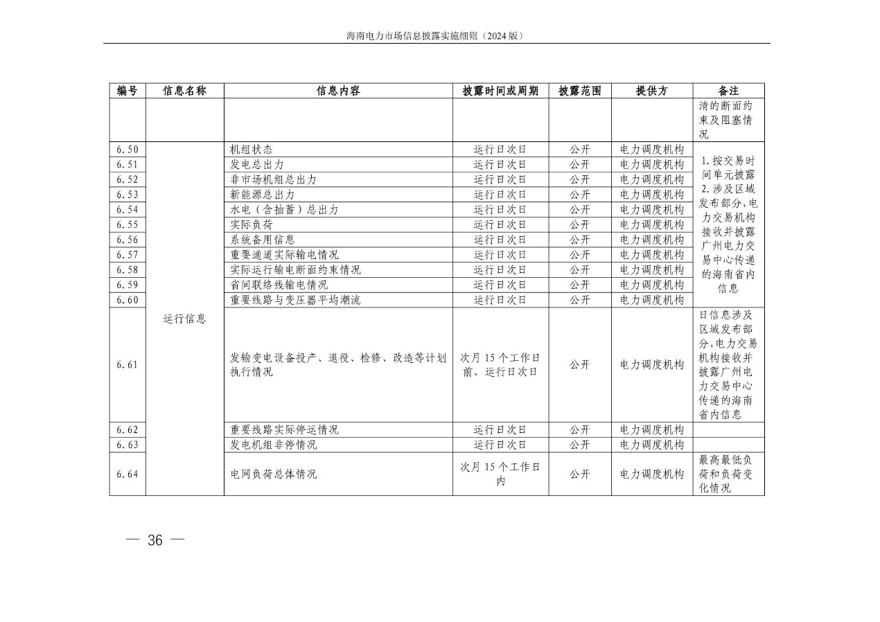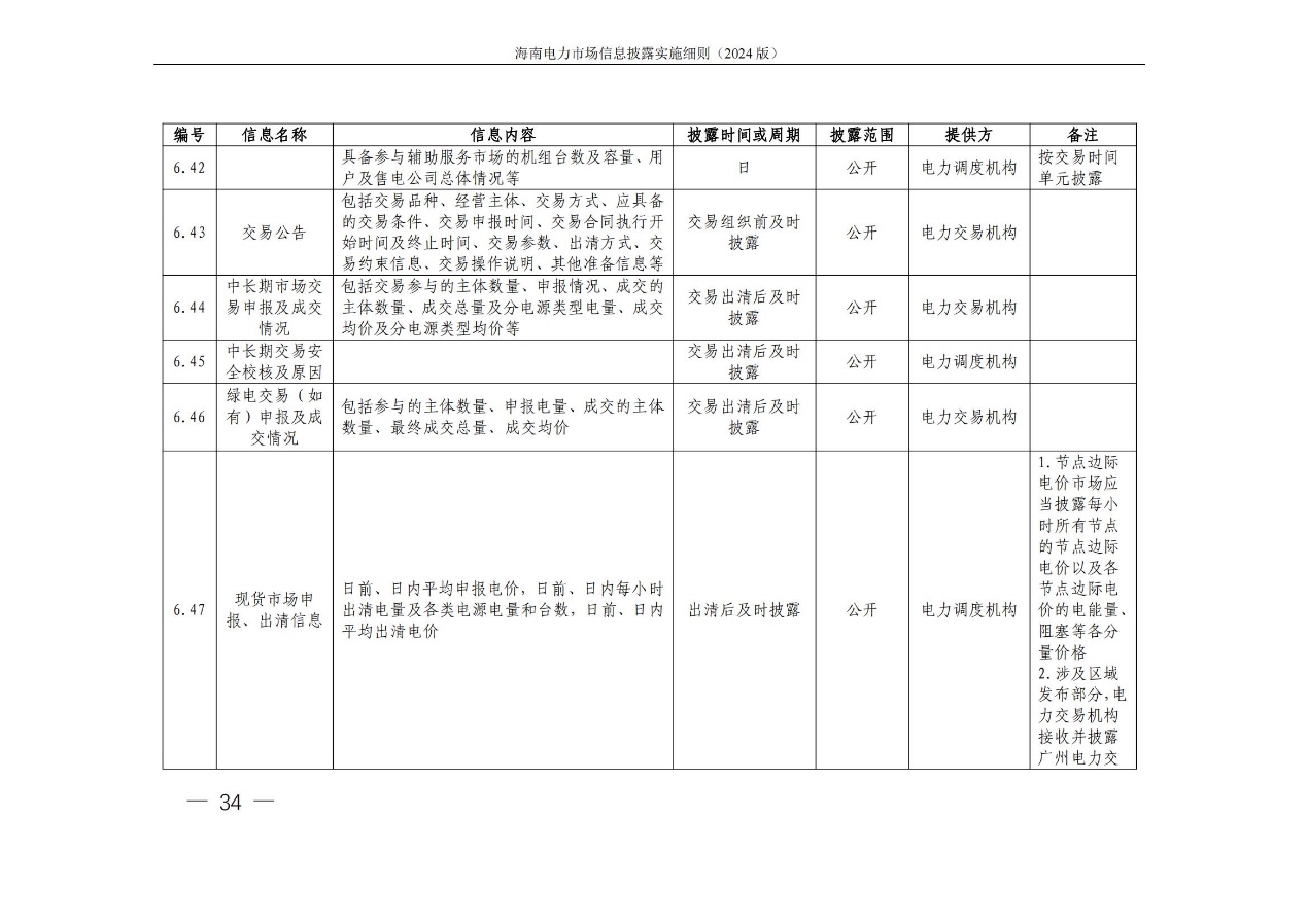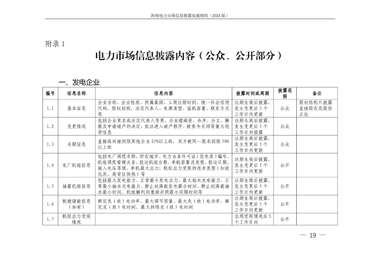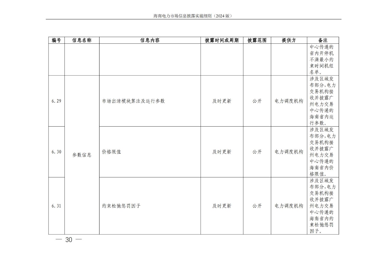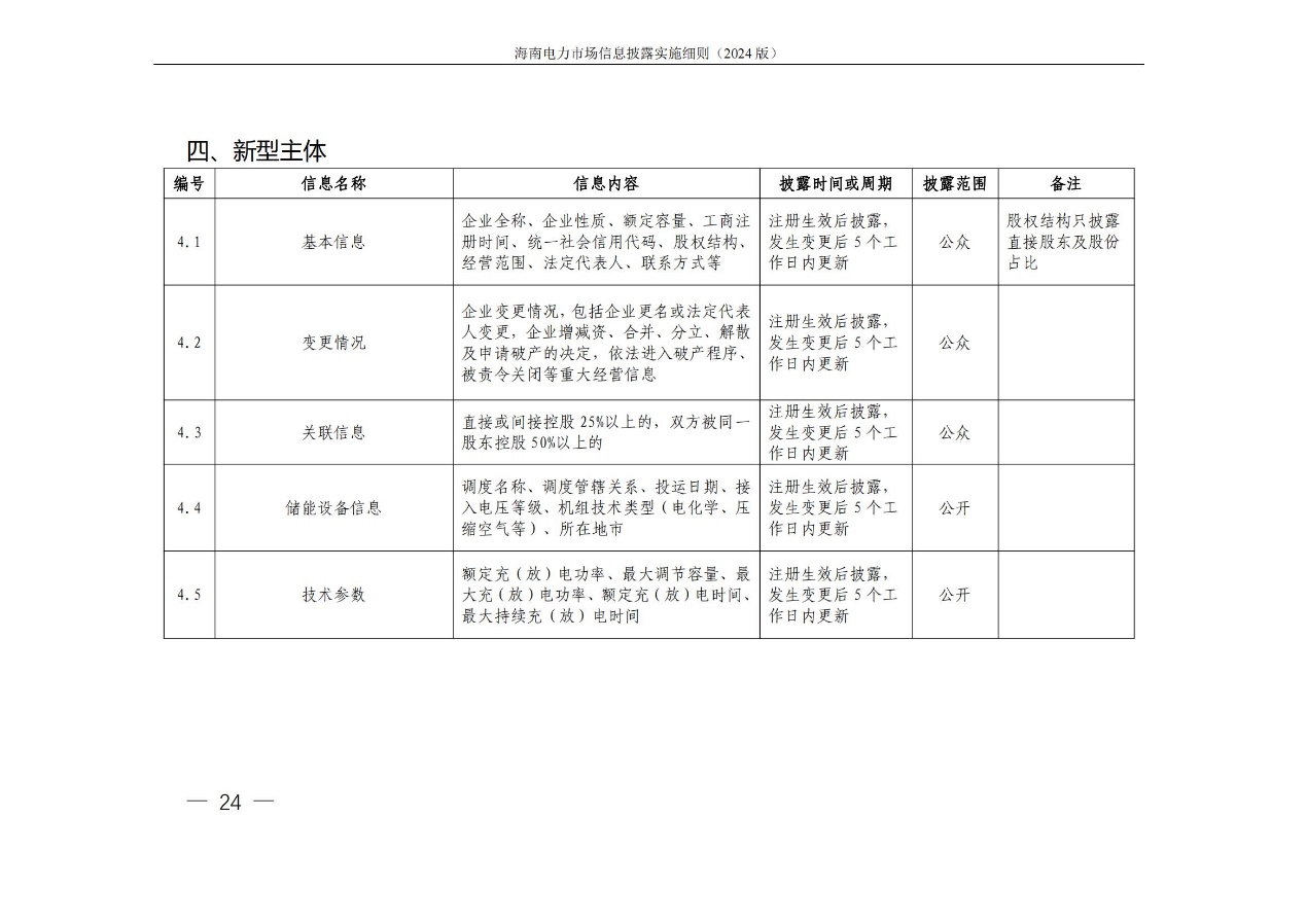 据悉,海南电力交易中心发布关于印发《海南电力市场信息披露实施细则(2024年版)》的通知,其中提出,细则所称信息披露主体指参与海南电力市场的市场成 员,包括海南电力市场发电企业、售电公司、电力用户、新型主 体(独立储能等)、电网企业和市场运营机构。市场运营机构包 括电力交易机构(指海南电力交易中心)和电力调度机构(指海南电网电力调度控制中心)。