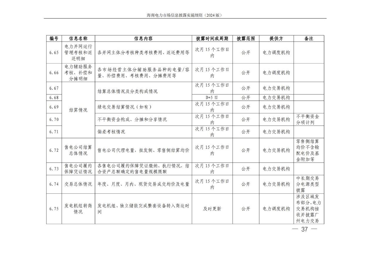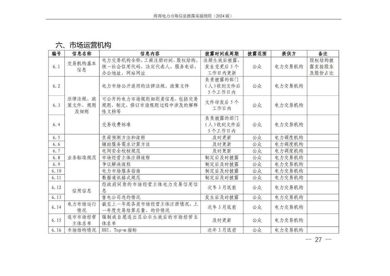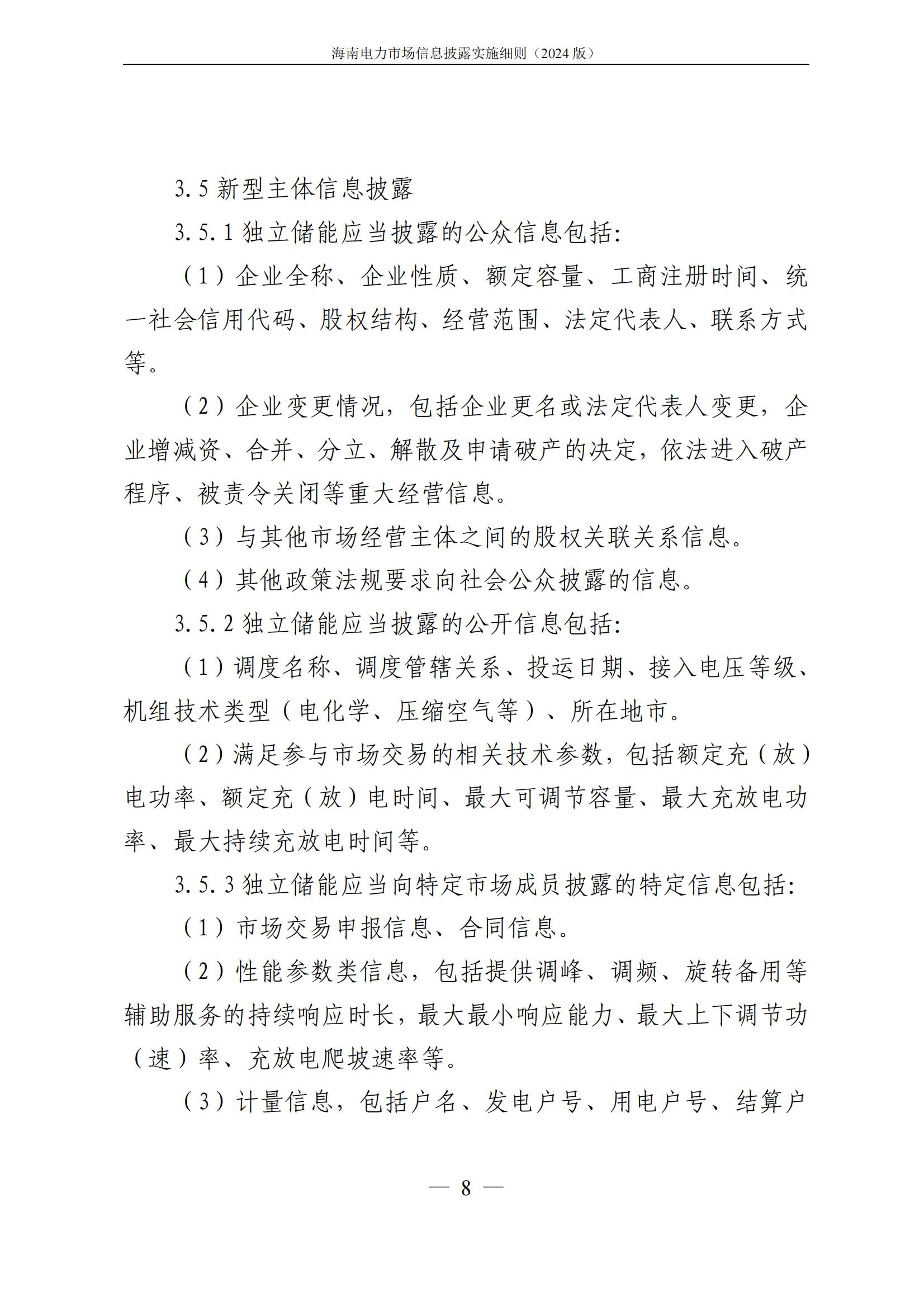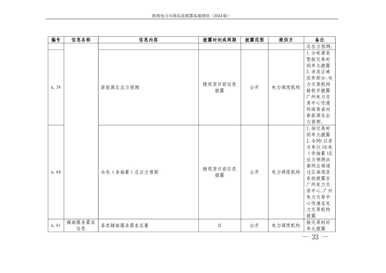 据悉,海南电力交易中心发布关于印发《海南电力市场信息披露实施细则(2024年版)》的通知,其中提出,细则所称信息披露主体指参与海南电力市场的市场成 员,包括海南电力市场发电企业、售电公司、电力用户、新型主 体(独立储能等)、电网企业和市场运营机构。市场运营机构包 括电力交易机构(指海南电力交易中心)和电力调度机构(指海南电网电力调度控制中心)。