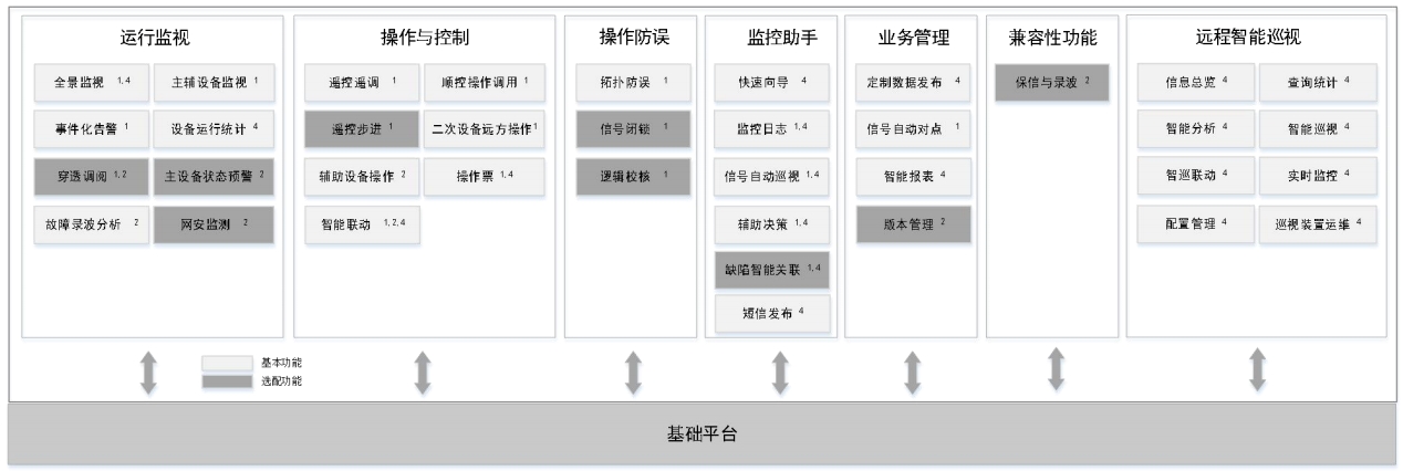 在第5部分:功能应用中,提到了变电站集中监控系统功能应用包括运行监视、操作与控制、操作防误、监控助手、业务管理、远程智能巡视六类应用,以及兼容存量的保信与录波的兼容性功能应用。