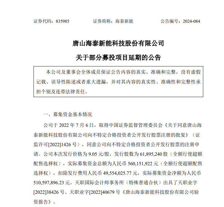 海泰新能表示,本次募投项目延期,是公司根据项目实际情况做出的审慎决定,项目延期仅涉及募投项目进度的变化,未改变项目的建设内容、实施主体、募集资金用途及投资总额,不存在变相改变募集资金投向和损害股东利益的情形。本次公司对募投项目的延期是为了更好地提高募投项目建设质量,符合公司长期发展规划与股东的长远利益,不会对公司的正常经营产生不利影响。