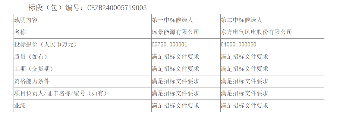 第一中标候选人:远景能源有限公司,投标报价:65750.000001万元。第二中标候选人:东方电气风电股份有限公司,投标报价:64000.000050万元。