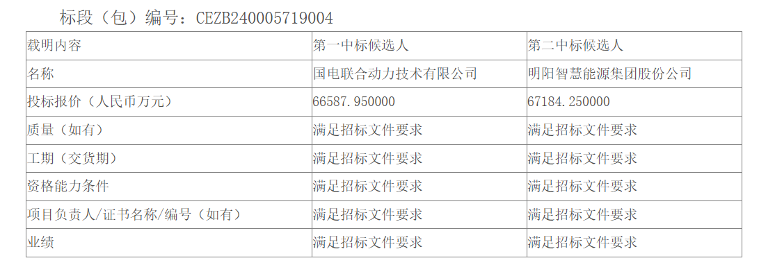 第一中标候选人:国电联合动力技术有限公司,投标报价:66587.950000万元。第二中标候选人:明阳智慧能源集团股份公司,投标报价:67184.250000万元。