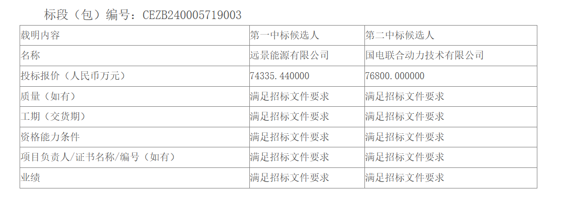 第一中标候选人:远景能源有限公司,投标报价:74335.440000万元。第二中标候选人:国电联合动力技术有限公司,投标报价:76800.000000万元。