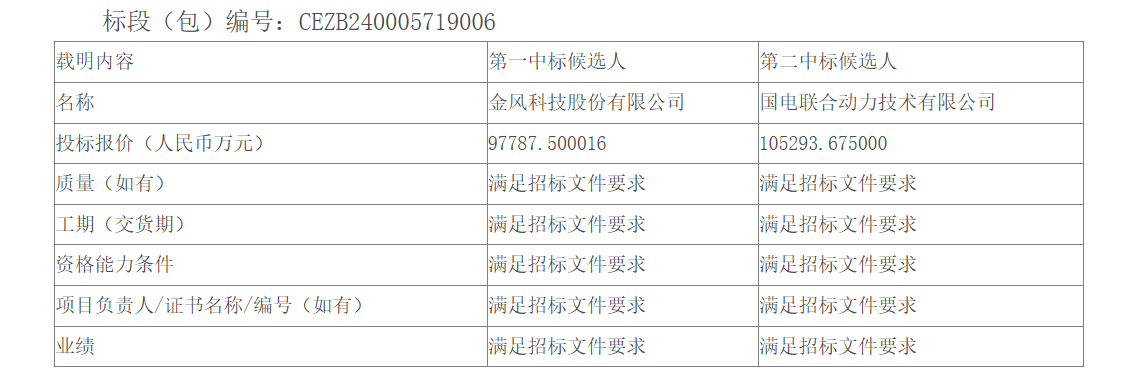 第一中标候选人:金风科技股份有限公司,投标报价:97787.500016万元。第二中标候选人:国电联合动力技术有限公司,投标报价:105293.675000万元。