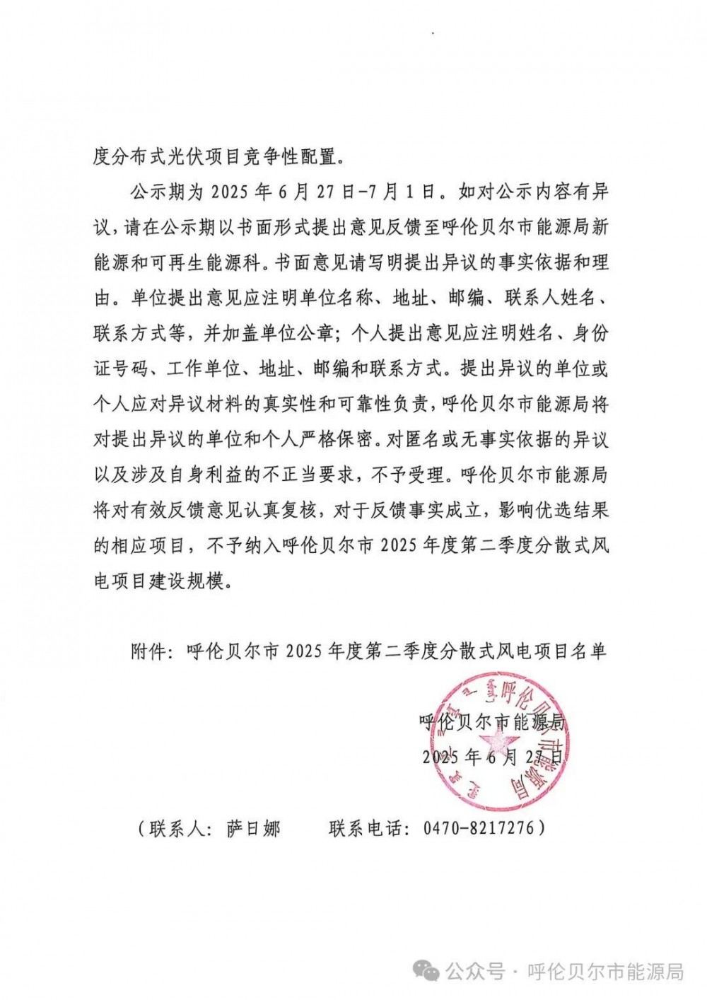 6月27日,呼伦贝尔市能源局发布关于呼伦贝尔市2025年第二季度分散式项目优选结果的公示。