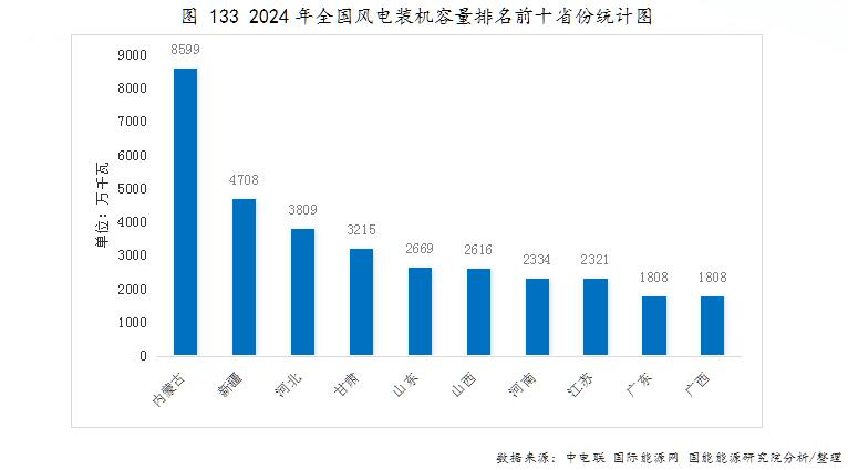 截至2024年12月底,内蒙古风电装机容量为8599万千瓦,位居全国首位。其次为新疆和河北,风电装机容量分别达到4708万千瓦和3809万千瓦。