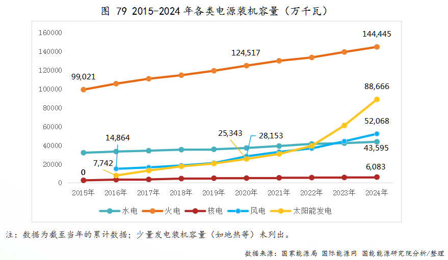 截至2024年12月底,全国累计发电装机容量334862万千瓦,同比增长14.6%。其中,水电装机容量43595万千瓦,同比增长3.2%;火电装机容量144445万千瓦,同比增长3.8%;核电装机容量6083万千瓦,同比增长6.9%;并网风电装机容量52068万千瓦,同比增长18.0%;并网太阳能发电装机容量88666万千瓦,同比增长45.2%。