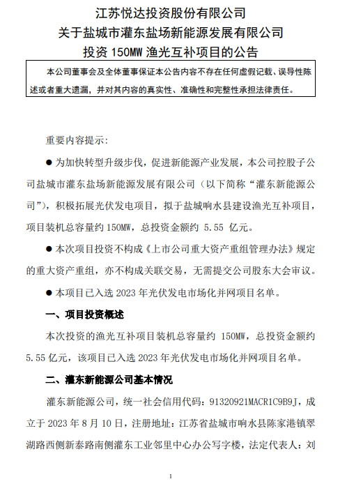 公告显示,悦达投资控股子公司盐城市灌东盐场新能源发展有限公司,拟于盐城响水县建设渔光互补项目,项目装机总容量约 150mw,总投资金额约 5.55 亿元。