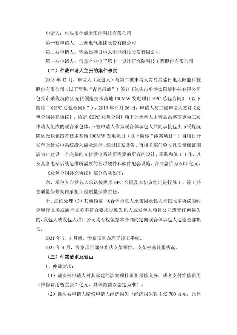 事件原由:2018 年 12 月,牟盛太阳能与第二被申请人青岛昌盛日电太阳能科技股份有限公司(以下简称“青岛昌盛”)签订《包头市牟盛太阳能科技有限公司包头市采煤沉陷区光伏领跑技术基地 100mw 发电项目 epc 总包合同》。2019 年 9 月 26 日,牟盛太阳能与三被申请人签订《总包合同补充协议》,约定《epc 总包合同》项下的承包人由青岛昌盛变更为三被申请人组成的联合承包体。三被申请人作为联合体承包人共同承接包头市采煤沉陷区光伏领跑者技术基地 100mw 发电项目自项目开发至光伏发电系统投入商业运行、通过国家及省、市相关部门验收且质量保证期满为止建设一个完整的光伏发电系统所需要的所有的设计、采购和施工工作,以及具备电站后续运维所需要的各项硬件和软件配套设施。合同总价为 6.04 亿元。