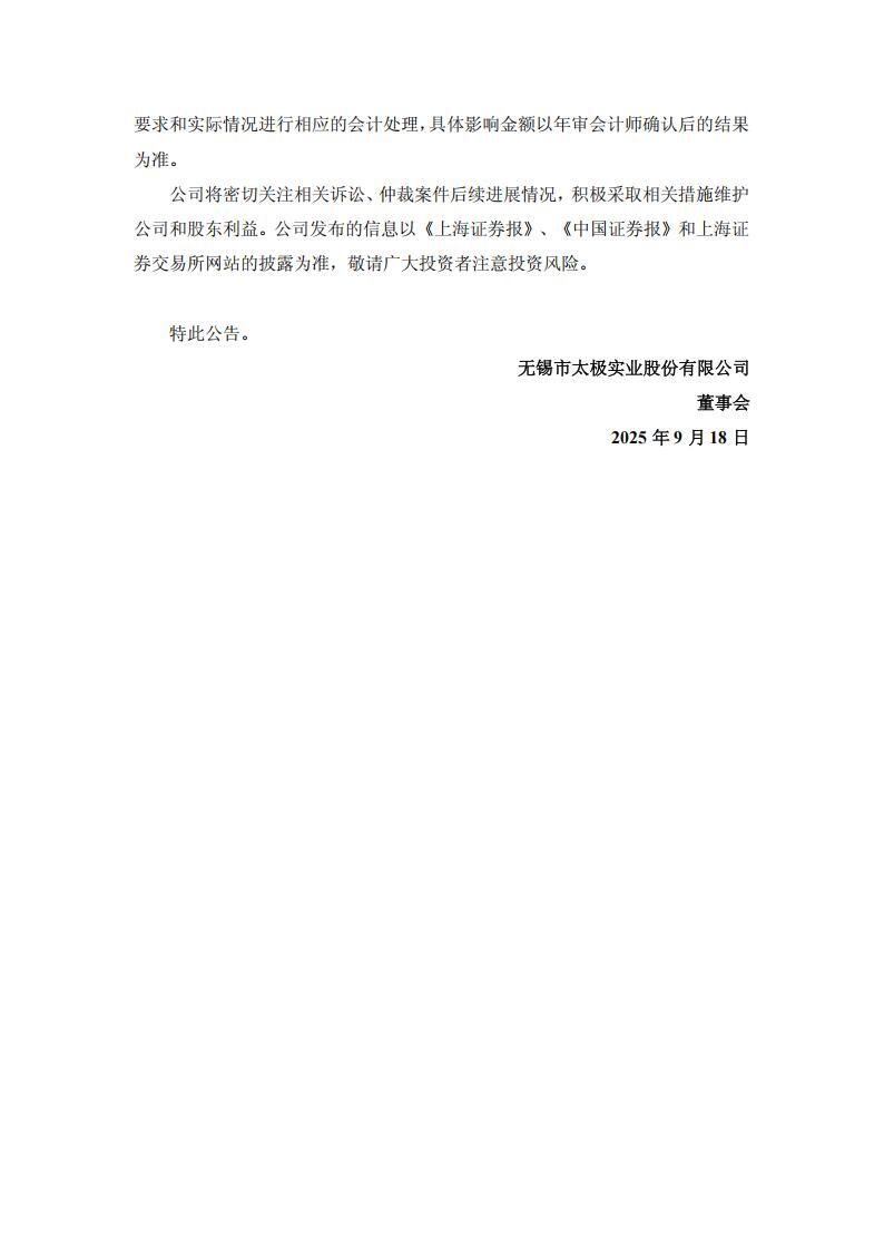 9月18日,太极实业发布关于累计诉讼、仲裁事项的公告。