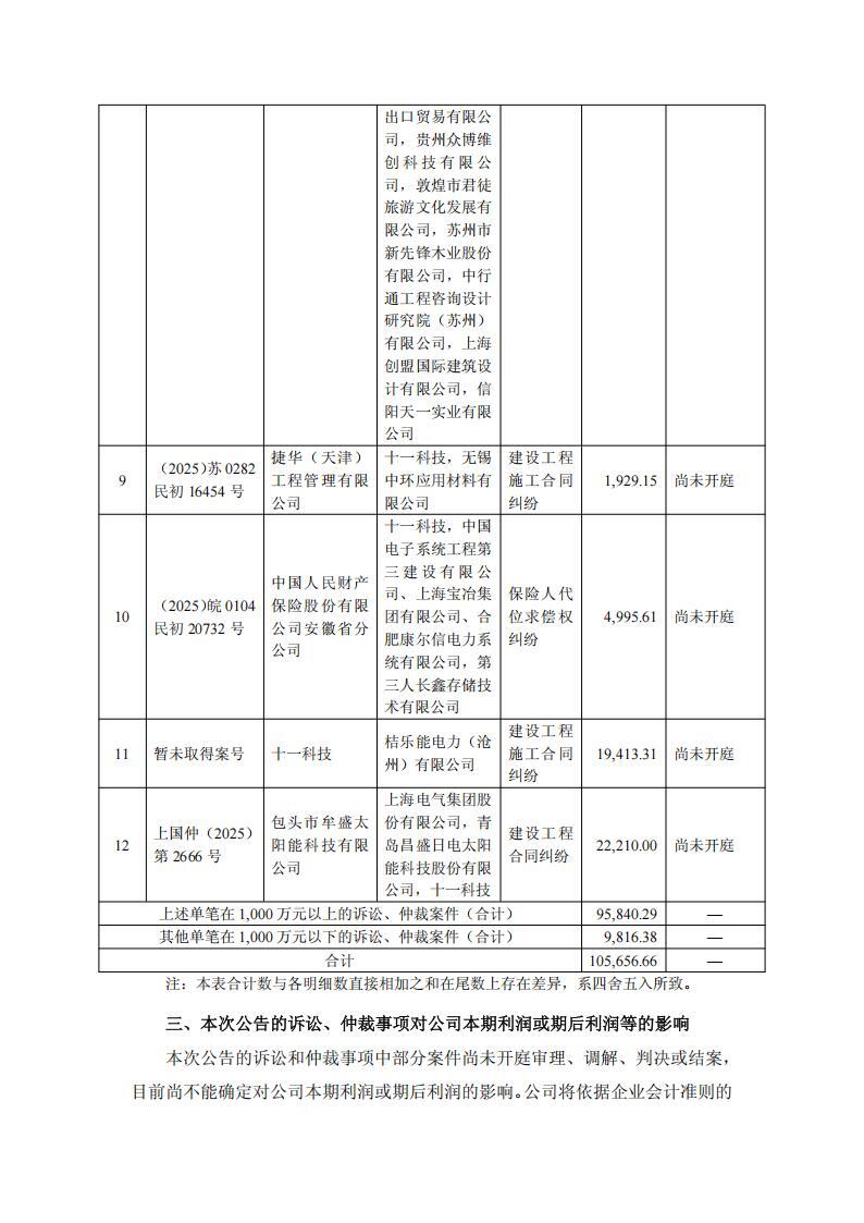公告显示,太极实业子公司十一科技于近日收到上海国际经济贸易仲裁委员会(上海国际仲裁中心)仲裁通知【上国仲(2025)第 2666 号】。因建设工程合同纠纷,包头市牟盛太阳能科技有限公司向上海国际经济贸易仲裁委员会提起了以上海电气集团股份有限公司、青岛昌盛日电太阳能科技股份有限公司、十一科技三方为被申请人的仲裁申请。