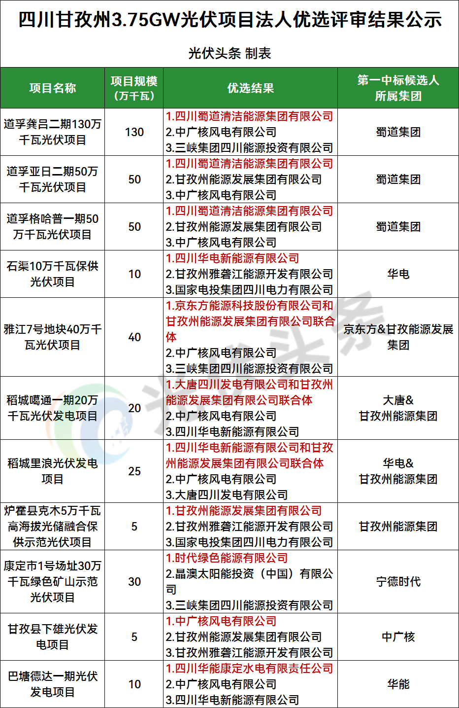按评审结果第一中标候选人来看,蜀道集团获得规模最大,共2.3gw;京东方&甘孜能源发展集团联合体获得400mw项目,排名第二。此外,宁德时代、华电&甘孜能源发展集团、大唐&甘孜能源发展集团、华电、华能、甘孜能源发展集团、中广核等企业或联合体均有所获,详情如下: