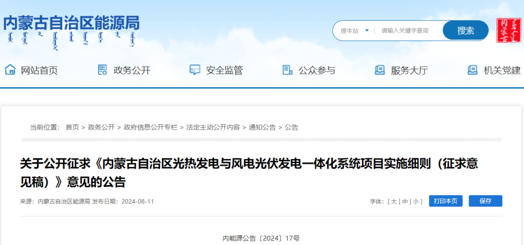 8月11日,内蒙古自治区能源局发布关于公开征求《内蒙古自治区光热发电与风电光伏发电一体化系统项目实施细则(征求意见稿)》意见的公告。
