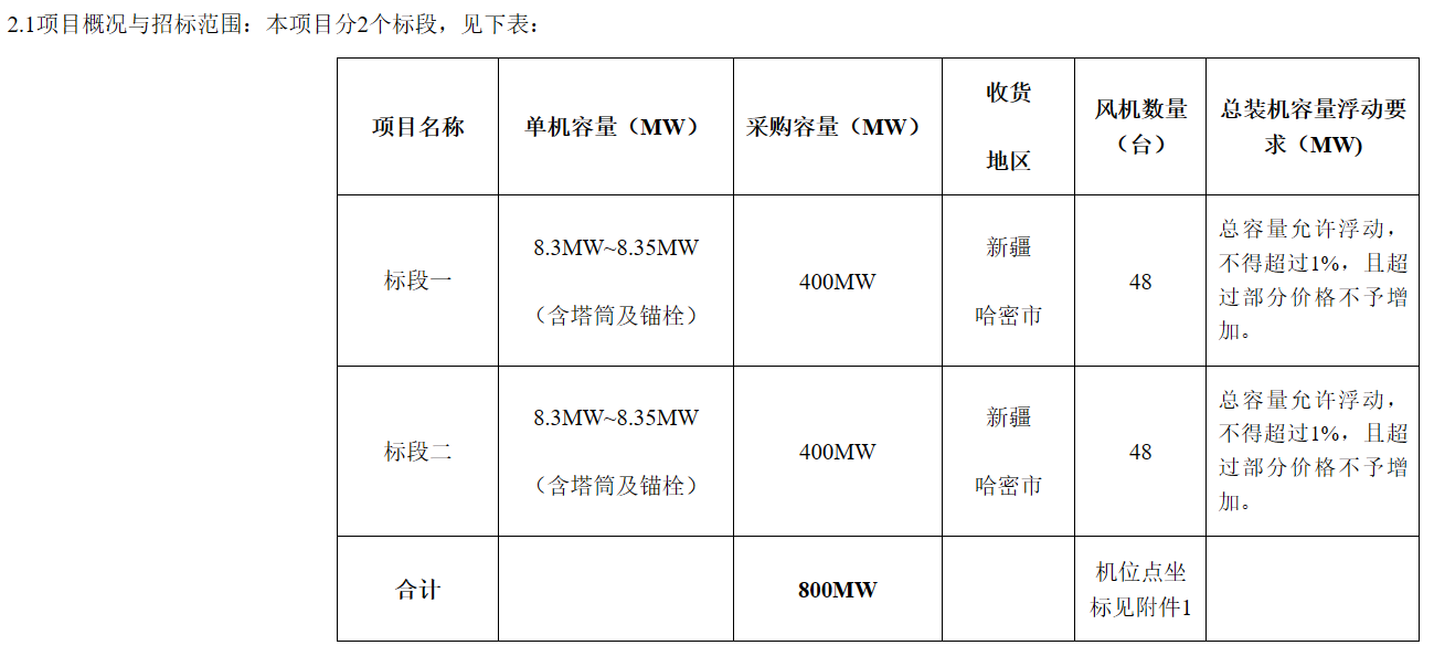 招标范围:以招标文件为准,其中叶轮直径不小于210m,轮毂高度不低于120m。