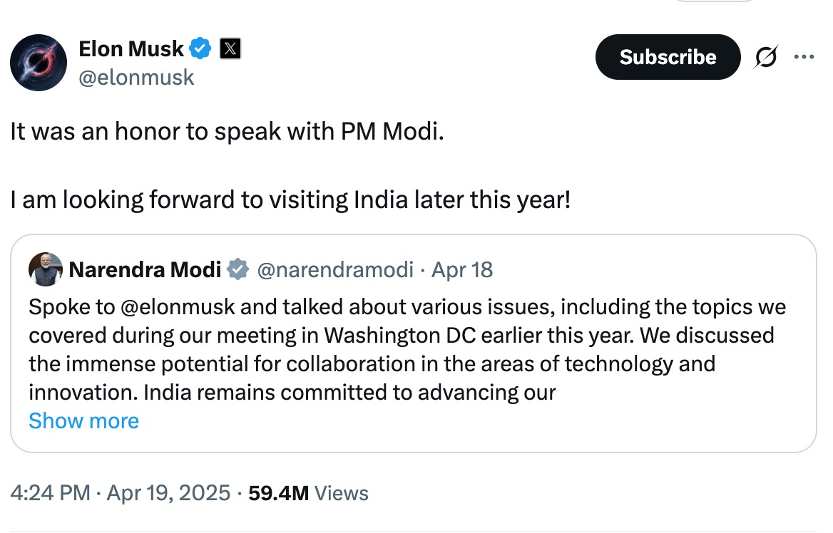 不过,马斯克与印度当局的关系仍然复杂。比如,x(原名推特)与印度政府在内容审核方面存在争议。