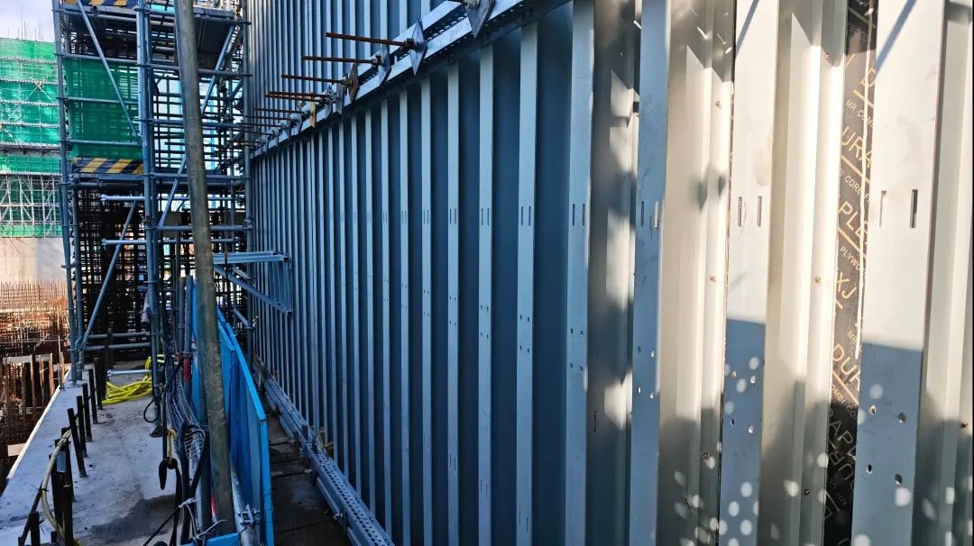 大模板凭借精密的支撑与紧固系统,可高效抵御新浇混凝土产生的侧压力,显著降低模板变形、鼓胀风险。相较于小块散拼模板,大模板大幅减少接缝数量,经特殊设计与处理后,能有效防止漏浆问题,确保浇筑出的混凝土墙面平整光洁,完全契合核电工程对高品质混凝土外观的严苛标准。在项目施工过程中,少拉杆设计大幅缩短施工周期;上部操作平台的创新设置,既减少了脚手架搭设量,又避免了交叉作业干扰,显著提升结构施工质量、精度与效率,同步强化作业安全性,为混凝土振捣作业提供了便捷、高效的操作空间。