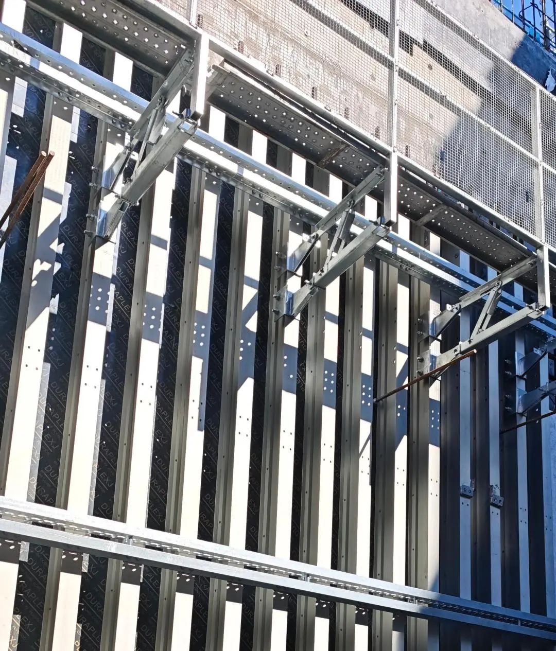 在编制施工方案阶段,项目管理团队便对现场大模板支设工况进行深度调研与系统性规划。通过精准设计与精细化制造流程,定制的直行墙大模板在生产环节实现了高度一致性与施工精度保障。此外,大模板系统依托标准化、模块化设计理念,显著简化了施工过程中的组织管理与多方协调工作,不仅大幅提升项目管理效能、有效缩短施工周期,还通过优化资源配置降低了综合成本,实现施工效率与经济效益的双重提升。