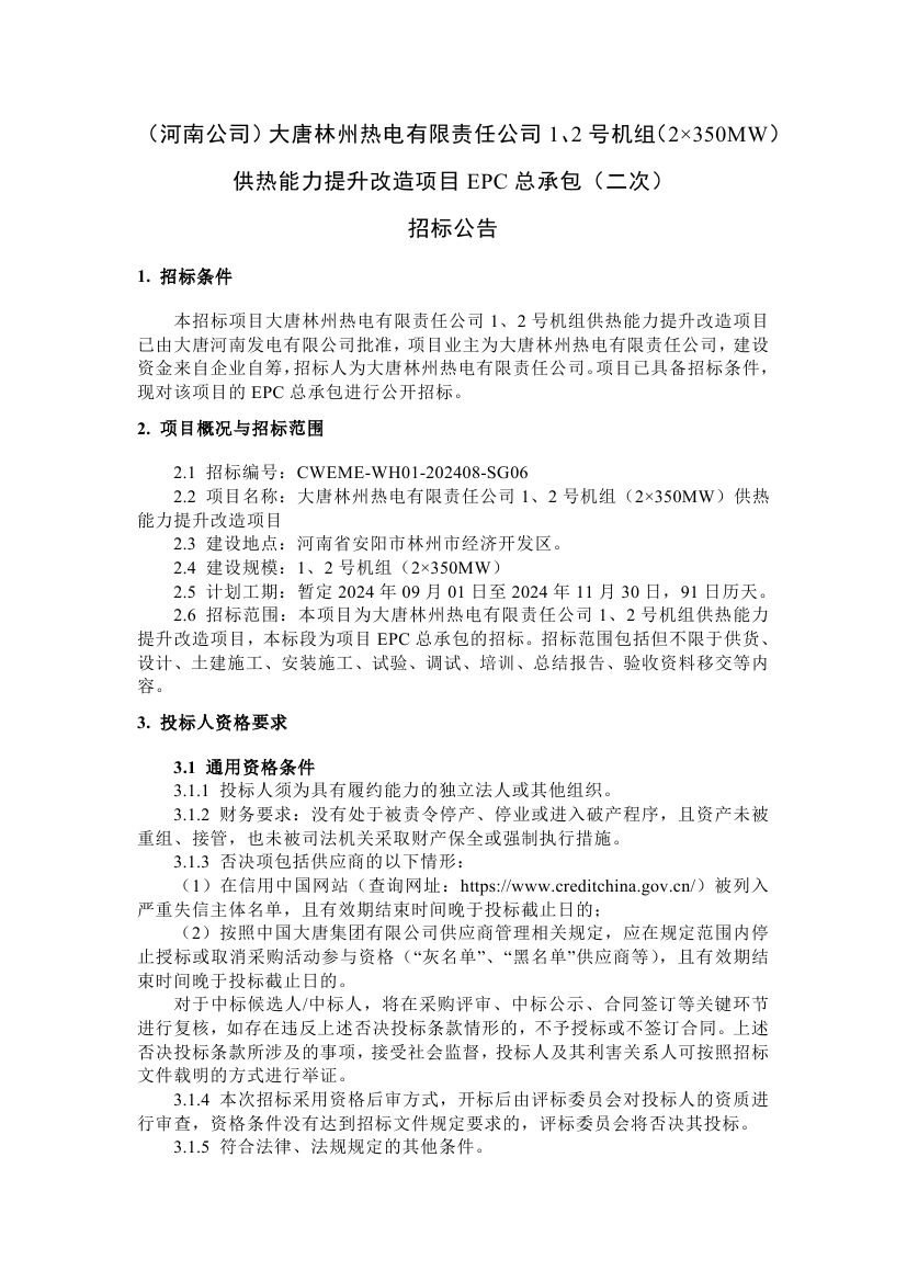 【(河南公司)大唐林州热电有限责任公司1、2号机组(2x350mw)供热能力提升改造项目epc总承包(二次)】招标公告