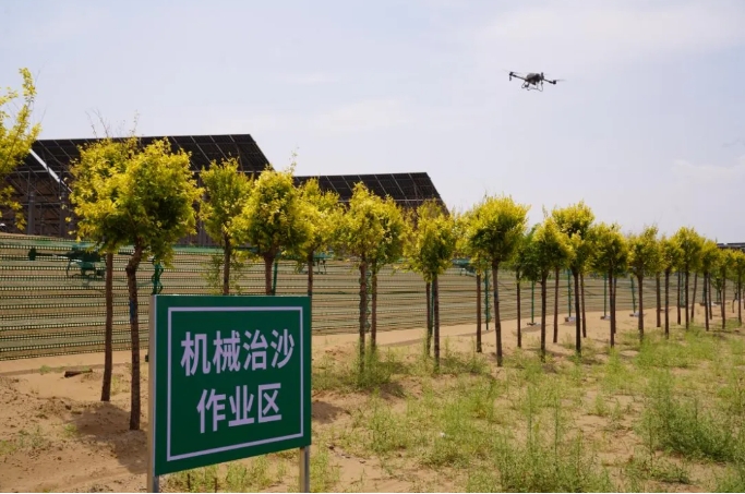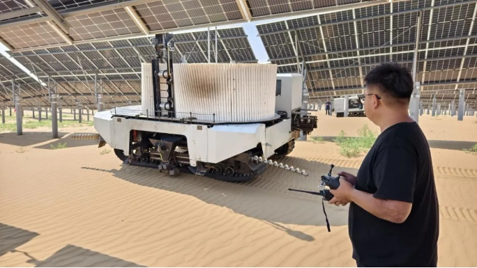 走进林光互补板下(间)种植区,飞播无人机携带80升杨柴、花棒草籽腾空而起,只需要810分钟就能完成约160亩沙漠的飞播作业;数架荒漠化综合治理种植机器人在工作人员的遥控下作业,每台机器人可载水3吨、栽苗6300株,每4秒便可种植1株苗木。三峡集团所属三峡陆上能源库布其基地项目先导工程生态治理项目现场负责人滕凤达高兴地说:我们大规模采用机械化种植后,沙漠绿化效率大大地提高了。