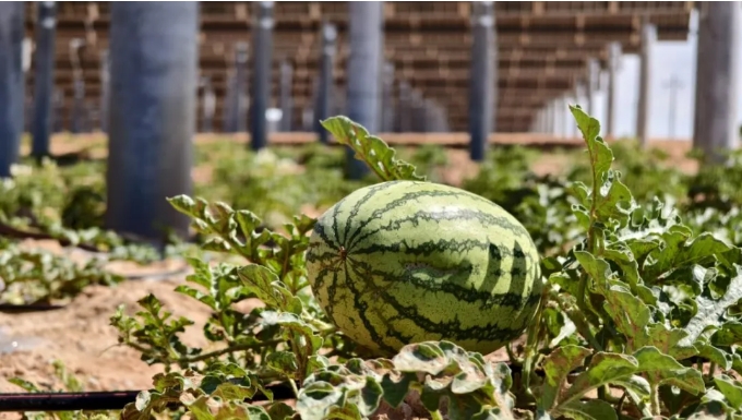 ▲光伏板间种植的西瓜茁壮成长,静待瓜熟蒂落。