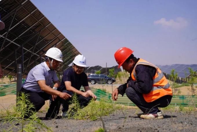 今年年初,在紧邻库布其沙漠北缘,由三峡集团联合内蒙古能源集团建设的库布其沙漠鄂尔多斯中北部新能源基地(以下简称库布其基地项目)先导工程生态治理进入现场施工阶段。经过几个月的建设,生态治理已初见成效:外围锁边林、内部道路防护林枝繁叶茂;林光互补板下(间)种植区绿草成茵;农光互补精品种植区瓜果飘香;技术研究应用示范基地沙障和植被种植实验有序推进。