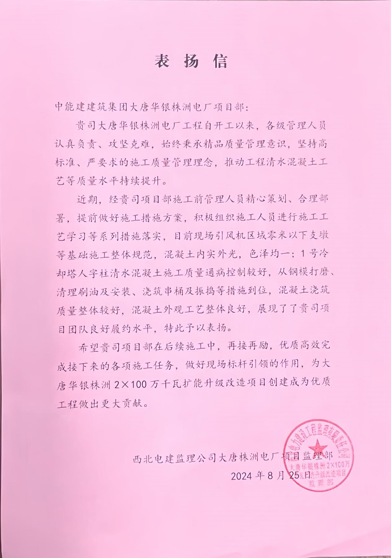 信中提到公司承建的株洲百万电厂工程自开工以来,各级管理人员认真负责、攻坚克难,始终乘承精品质量管理意识,坚持高标准、严要求的施工质量管理理念,推动工程清水混凝土工艺等质量水平持续提升。近期,在项目部施工前,管理人员精心策划、合理部署,提前做好施工措施方案,积极组织施工人员进行施工工艺学习等系列措施落实,目前现场引风机区域零米以下支墩等基础施工整体规范,混凝土内实外光,色泽均一;1号冷却塔人字柱清水混凝土施工质量通病控制较好,从钢模打磨清理刷油及安装、浇筑串桶及振捣等措施到位,混凝土浇筑质量整体较好,混凝土外观工艺整体良好,展现了项目团队良好履约水平,特此予以表扬。