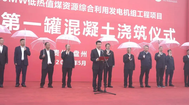 贵州省六盘水市委副书记、盘州市委书记杨引明出席仪式,六盘水市政府副市长李恒超讲话;盘州市委副书记、市长肖明致辞,市政府副市长章程主持仪式;中电建电力投资集团有限公司党委书记、董事长康建民,副总经理刘玉柱,贵州久泰邦达能源开发有限公司董事长余邦平,行政总裁余支龙,中国电建集团贵州工程有限公司党委书记、董事长郭玮,中国水利水电第九工程局有限公司党委书记、董事长周正荣出席开工仪式。