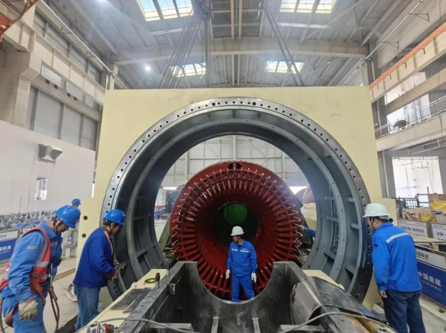 在螺栓紧固作业环节,面对 144 颗连接螺栓的高强度紧固任务,安装人员严格遵循施工规范,采用专业工具分阶段、分批次进行紧固操作,确保每一颗螺栓的紧固力矩都符合设计标准,有效保障了端罩与发电机机体连接的稳定性与密封性。经过两天的连续奋战,项目团队最终圆满完成了发电机定子的整体组装工作。