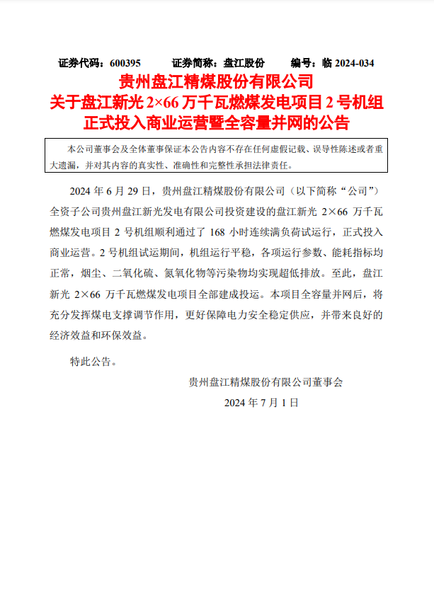 公告显示,2024年6月29日,贵州盘江精煤股份有限公司全资子公司贵州盘江新光发电有限公司投资建设的盘江新光 2×66 万千瓦燃煤发电项目 2 号机组顺利通过了168 小时连续满负荷试运行,正式投入商业运营。2 号机组试运期间,机组运行平稳,各项运行参数、能耗指标均正常,烟尘、二氧化硫、氮氧化物等污染物均实现超低排放。至此,盘江新光 2×66 万千瓦燃煤发电项目全部建成投运。