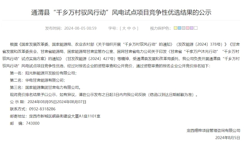 8月5日,通渭县人民政府发布《通渭县千乡万村驭风行动风电试点项目竞争性优选结果的公示》。