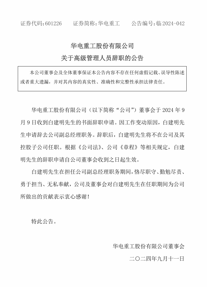 9月11日,华电重工发布公告称,公司董事会于9月9日收到白建明先生的书面辞职申请。因工作变动原因,白建明先生申请辞去公司副总经理职务。辞职后,白建明先生将不在公司及其控股子公司任职。根据《公司法》、公司《章程》等相关规定,白建明先生的辞职申请自公司董事会收到之日起生效。