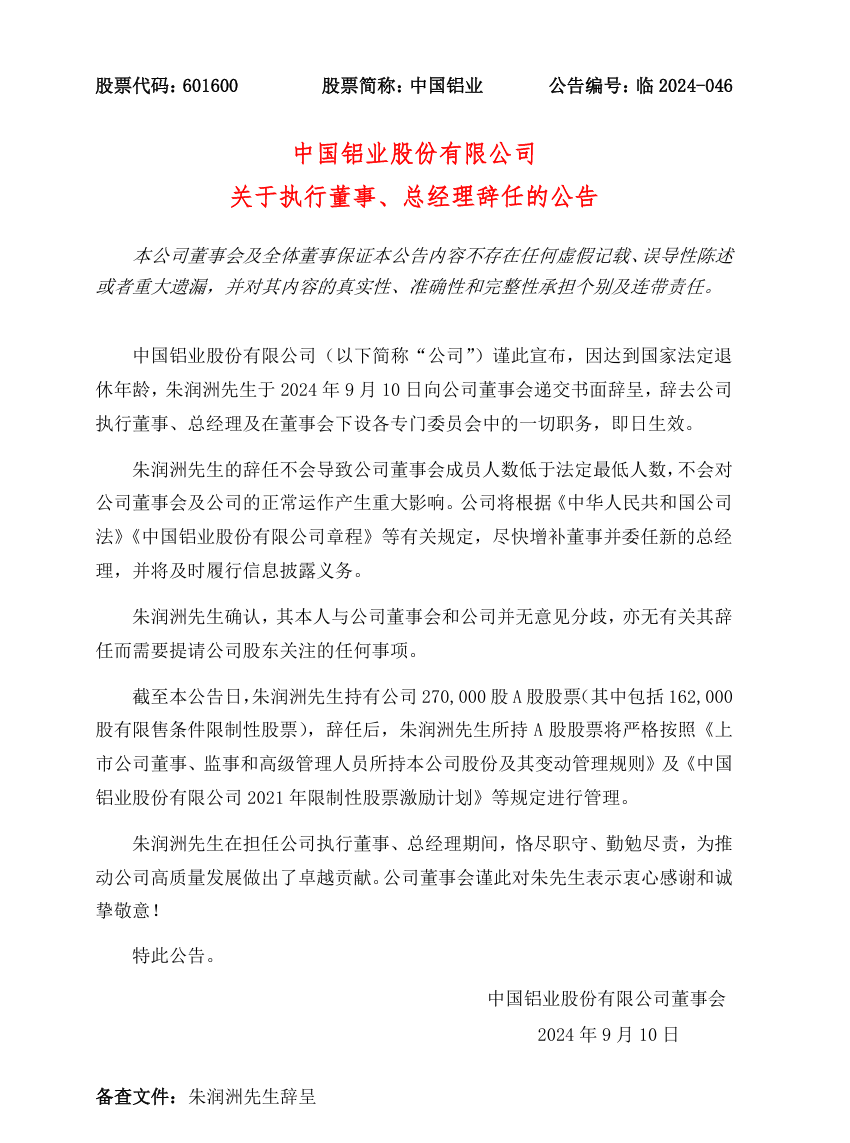 9月10日,中国铝业发布公告称,因达到国家法定退休年龄,朱润洲先生于2024年9月10日向公司董事会递交书面辞呈,辞去公司执行董事、总经理及在董事会下设各专门委员会中的一切职务,即日生效。
