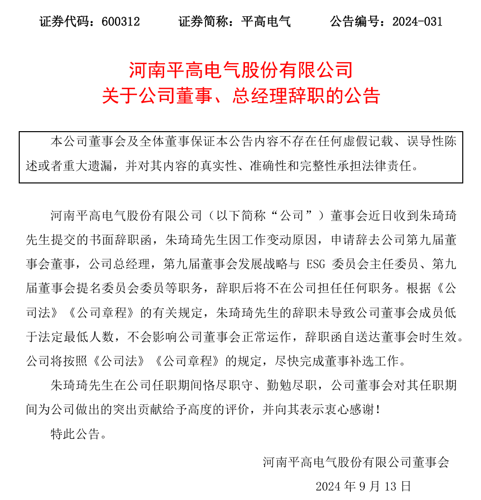 9月13日,河南平高电气股份有限公司发布公告,公司董事会近日收到朱琦琦提交的书面辞职函,因工作变动原因,申请辞去公司第九届董事会董事,公司总经理等职务。