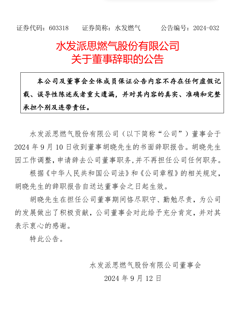 9月12日,水发燃气发布公告称,公司董事会于9月10日收到董事胡晓先生的书面辞职报告。胡晓先生因工作调整,申请辞去公司董事职务,并不再担任公司任何职务。