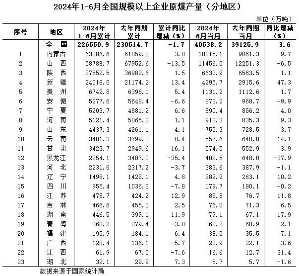 2024年1-6月份全国规模以上分省区原煤产量数据发布